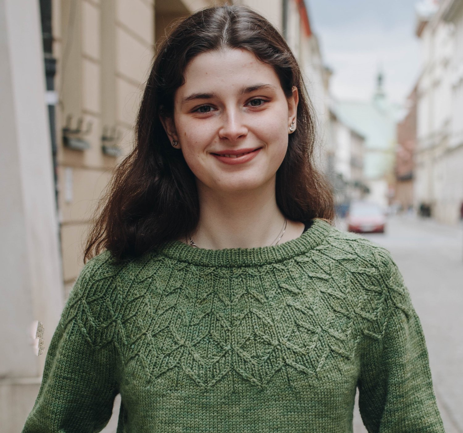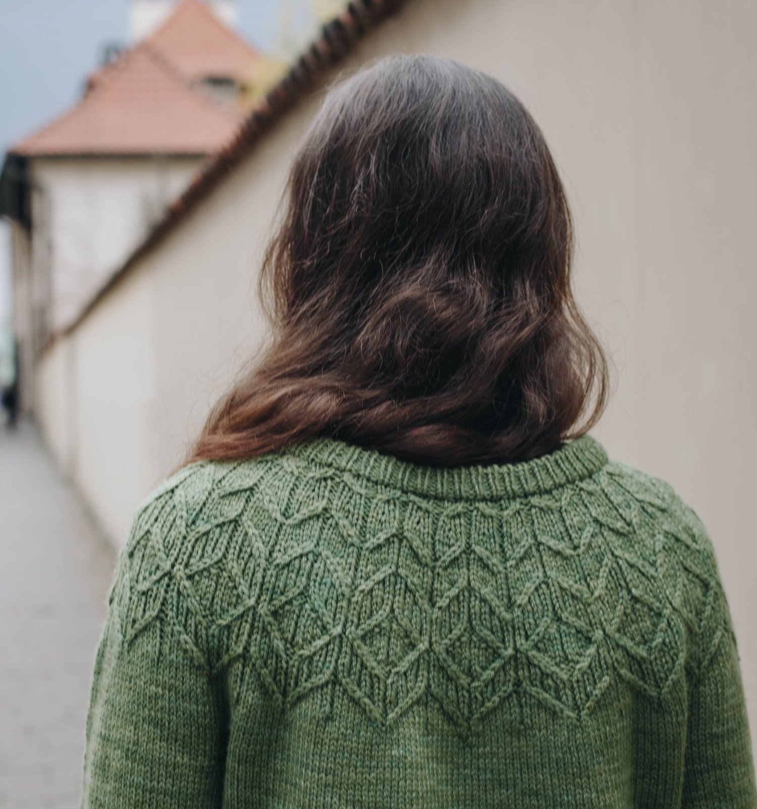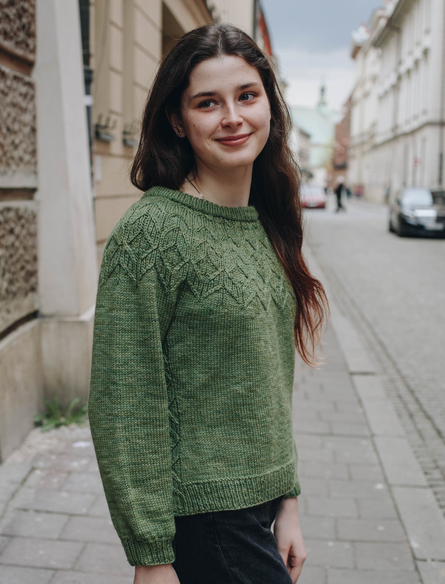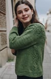 Susaen is a top-down seamless yoke sweater that is knit in the round. There is a double folded ribbed neckline followed by a textured yoke featuring knit, purl and travelling stitches, inspired by motifs from the Danish nightshirt tradition. Once the textured yoke charts are completed, there are short rows across the back in order to raise the back neckline, creating a more comfortable fit. There are textured panels running down both sides of the body. There is optional waist and hip shaping to add feminine shape, and the hem and wrist cuffs are finished off with ribbing.
