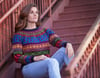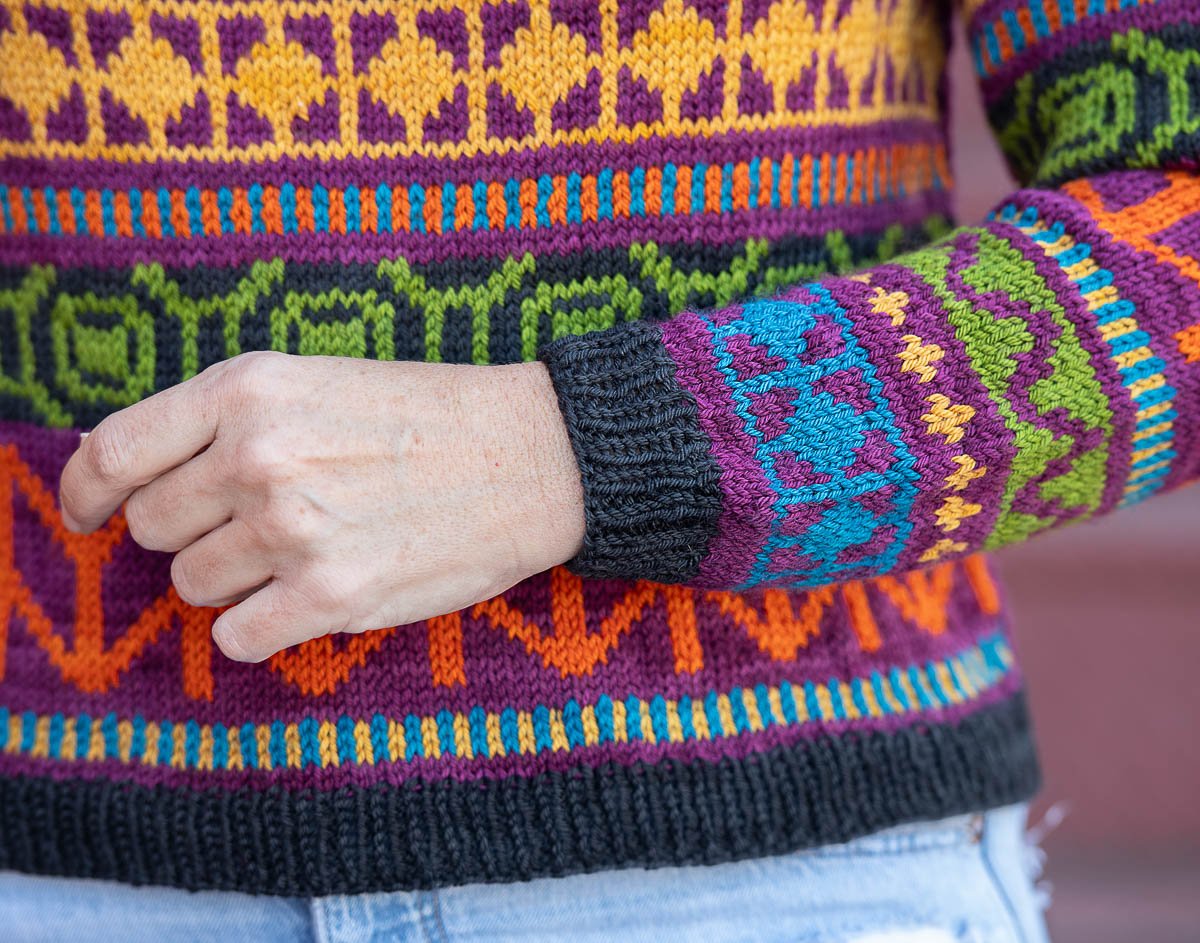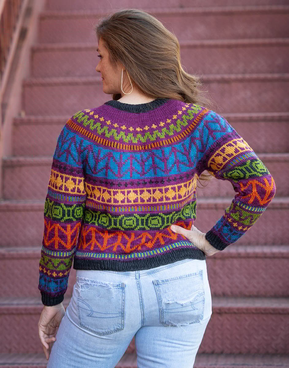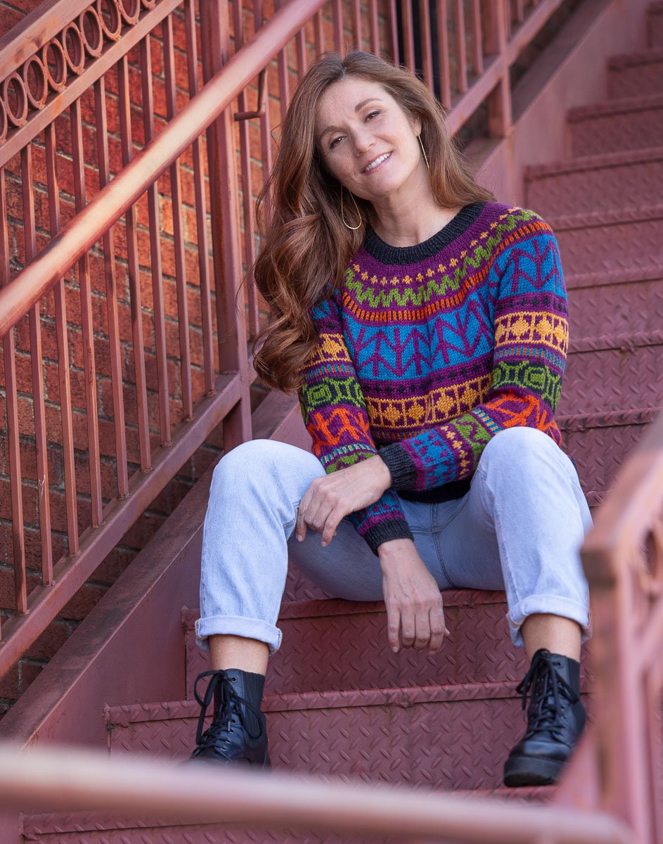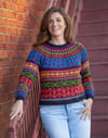 Nalinne is a top-down seamless yoke sweater with all over colorwork in a bold, contemporary motif. The ribbed neckline is followed by short rows at the back of the neck to create a comfortable fit. The cuffs and body are finished off in ribbing. The body has optional waistline shaping for a flattering fit worked by changing needle size. There is a seam that runs down the body and inside sleeve using slipped stitches.