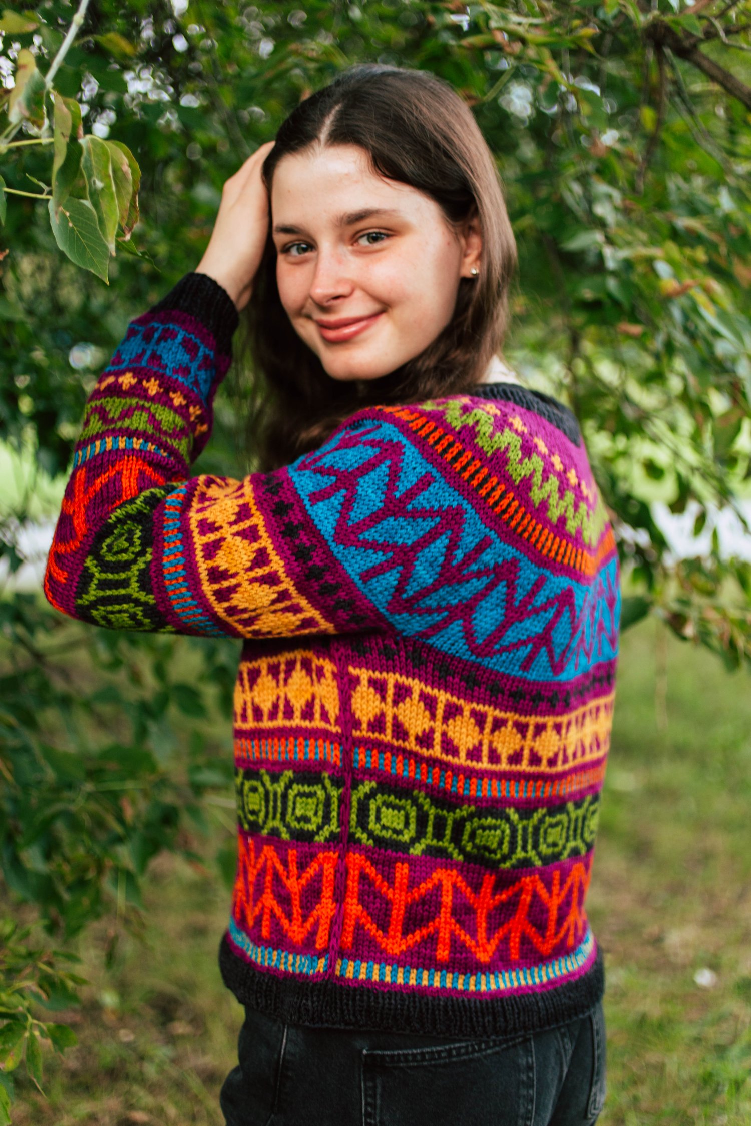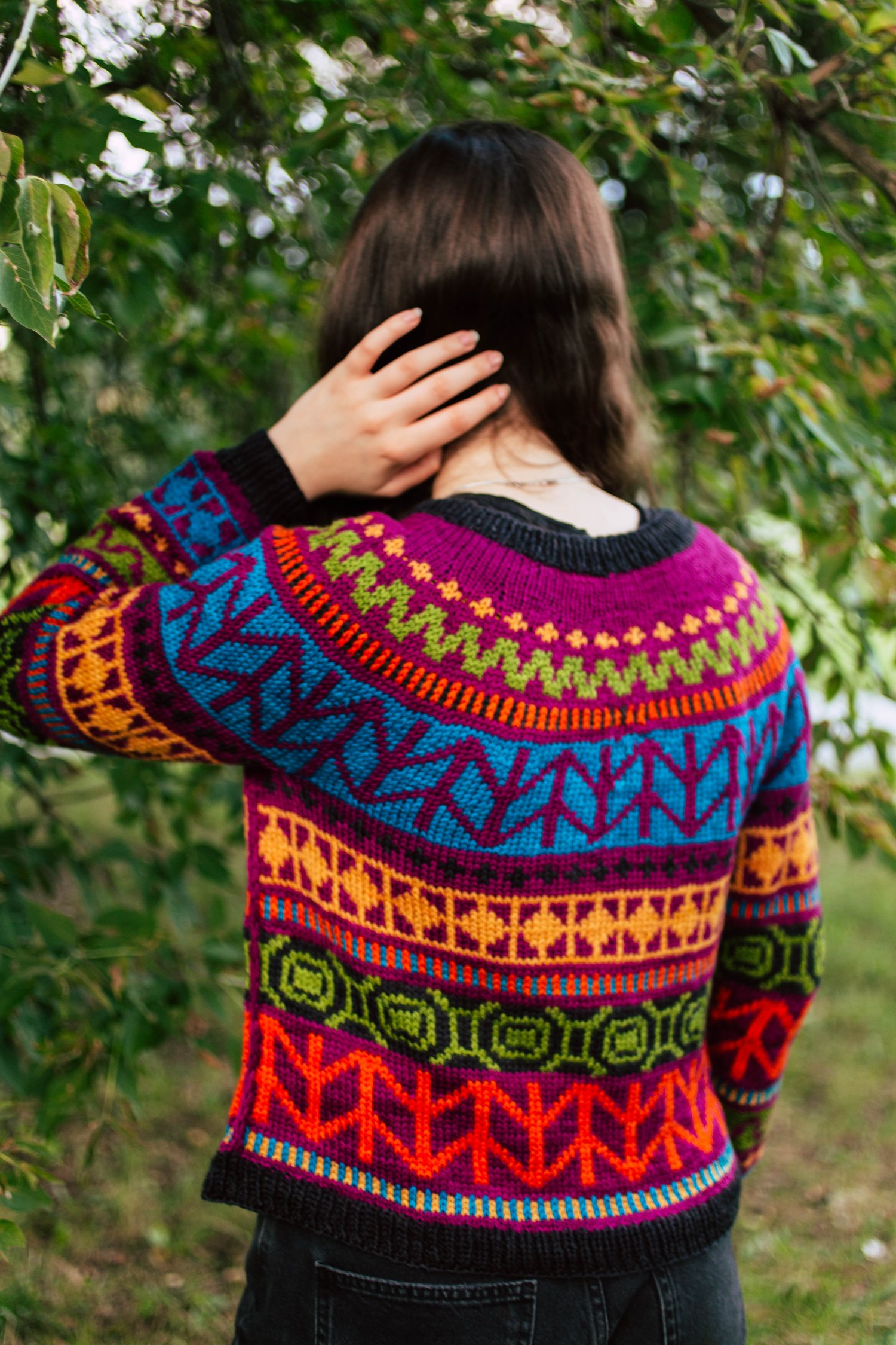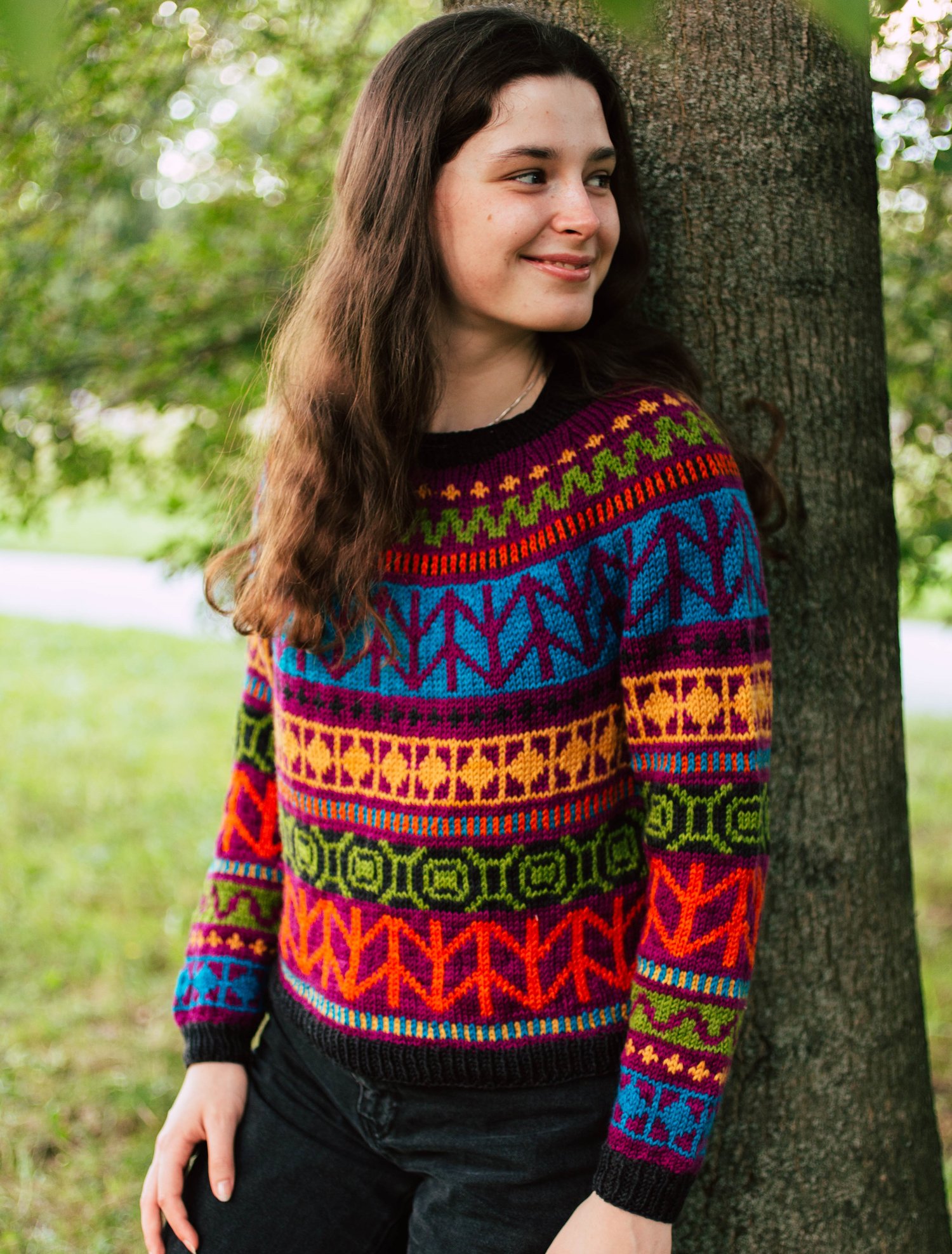 Nalinne is a top-down seamless yoke sweater with all over colorwork in a bold, contemporary motif. The ribbed neckline is followed by short rows at the back of the neck to create a comfortable fit. The cuffs and body are finished off in ribbing. The body has optional waistline shaping for a flattering fit worked by changing needle size. There is a seam that runs down the body and inside sleeve using slipped stitches.