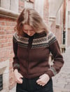 Abria is a top down seamless raglan cardigan that is knit flat. It features a ribbed neckline worked followed by short rows at the back of the neck that create a comfortable fit. There are raglan increases that are simultaneously worked with Fair Isle colourwork across the yoke.