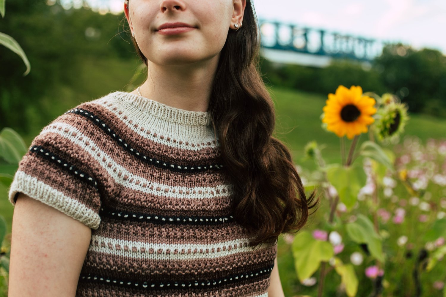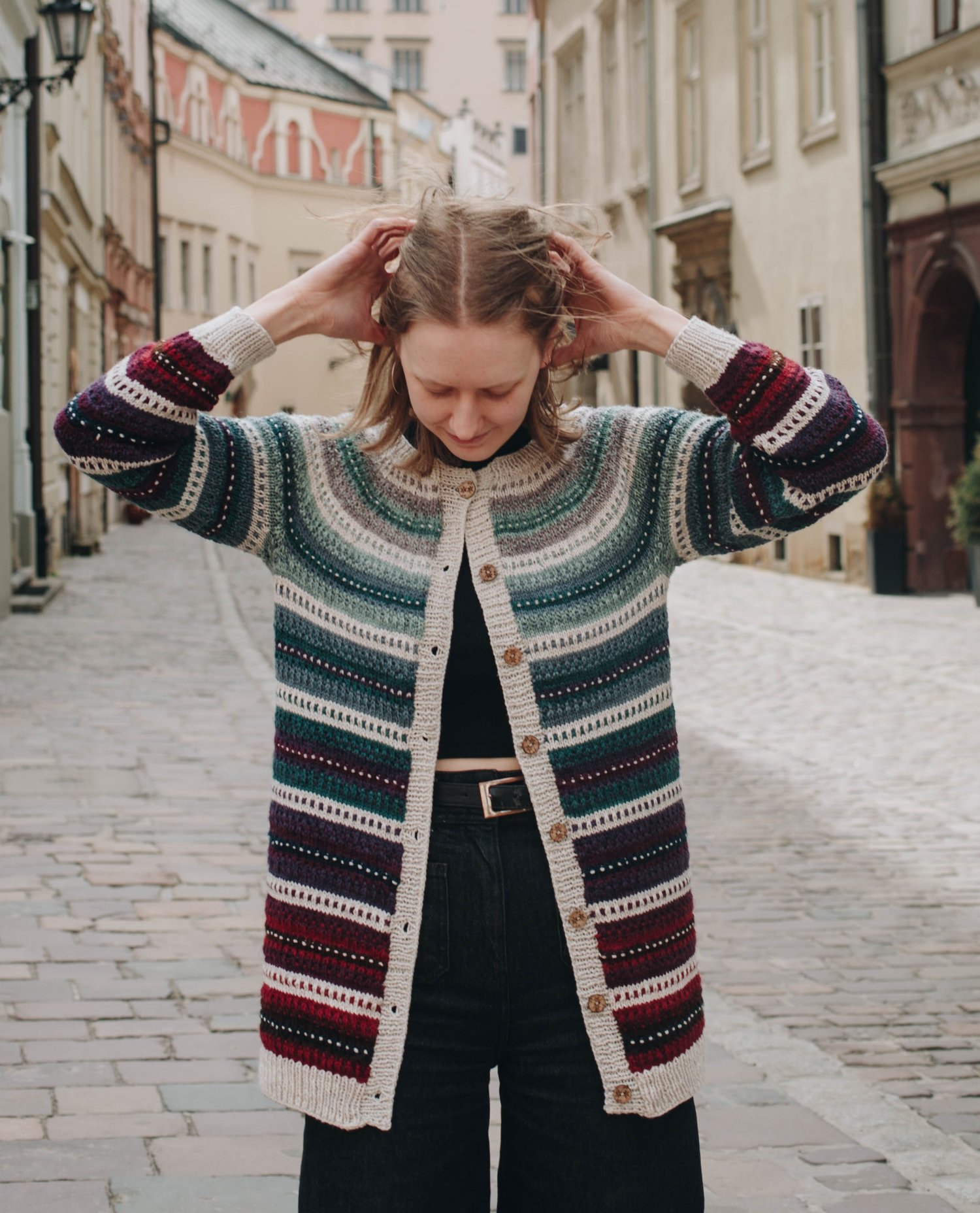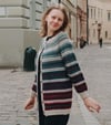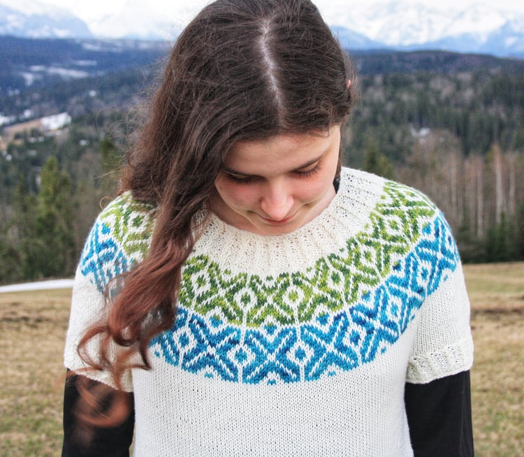 Lithriad is a top-down seamless yoke sweater that is knit in the round. There is a ribbed neckline followed by short rows at the back of the neck for a comfortable fit. There is a repeated slip stitch motif all the way down the sweater. There is never more than one colour used in each round, so knitting Lithriad is simple to work, but creates effective textured colorwork. This pattern includes alternatives for short sleeves, long sleeves, as well as a steeked cardigan.