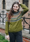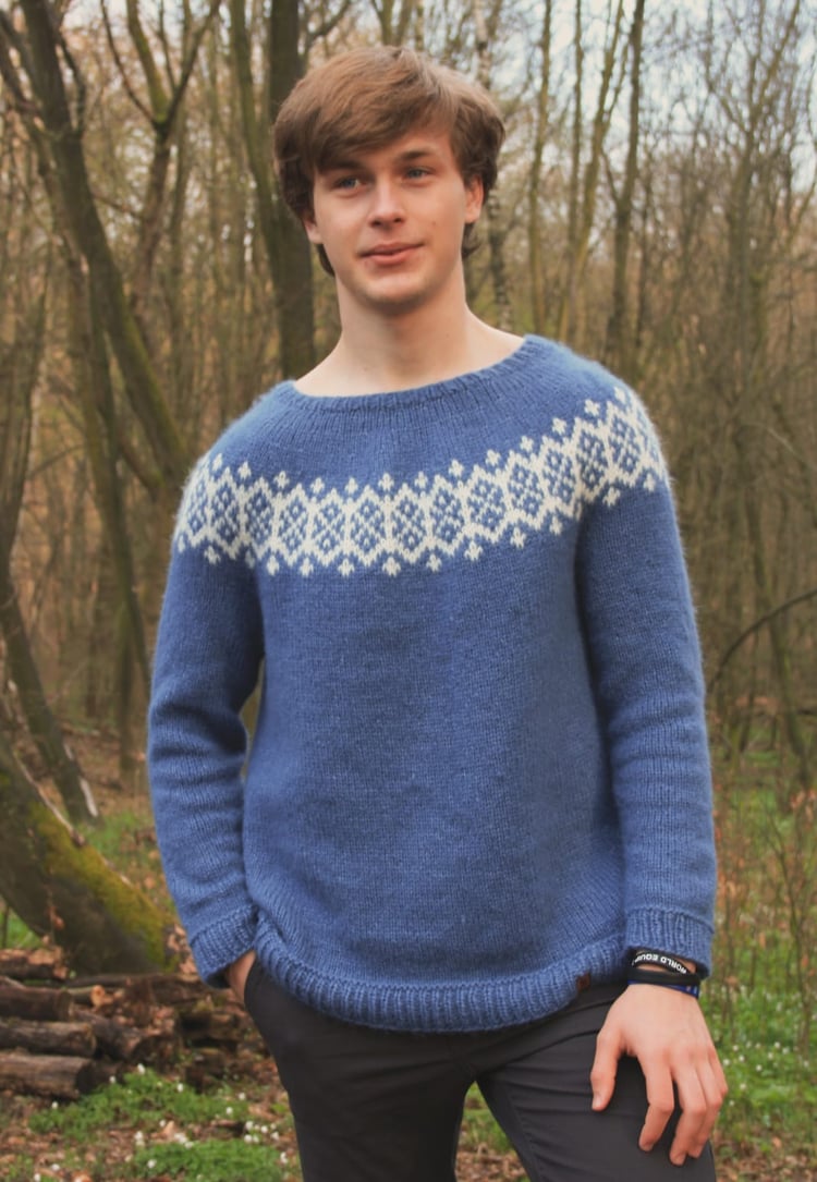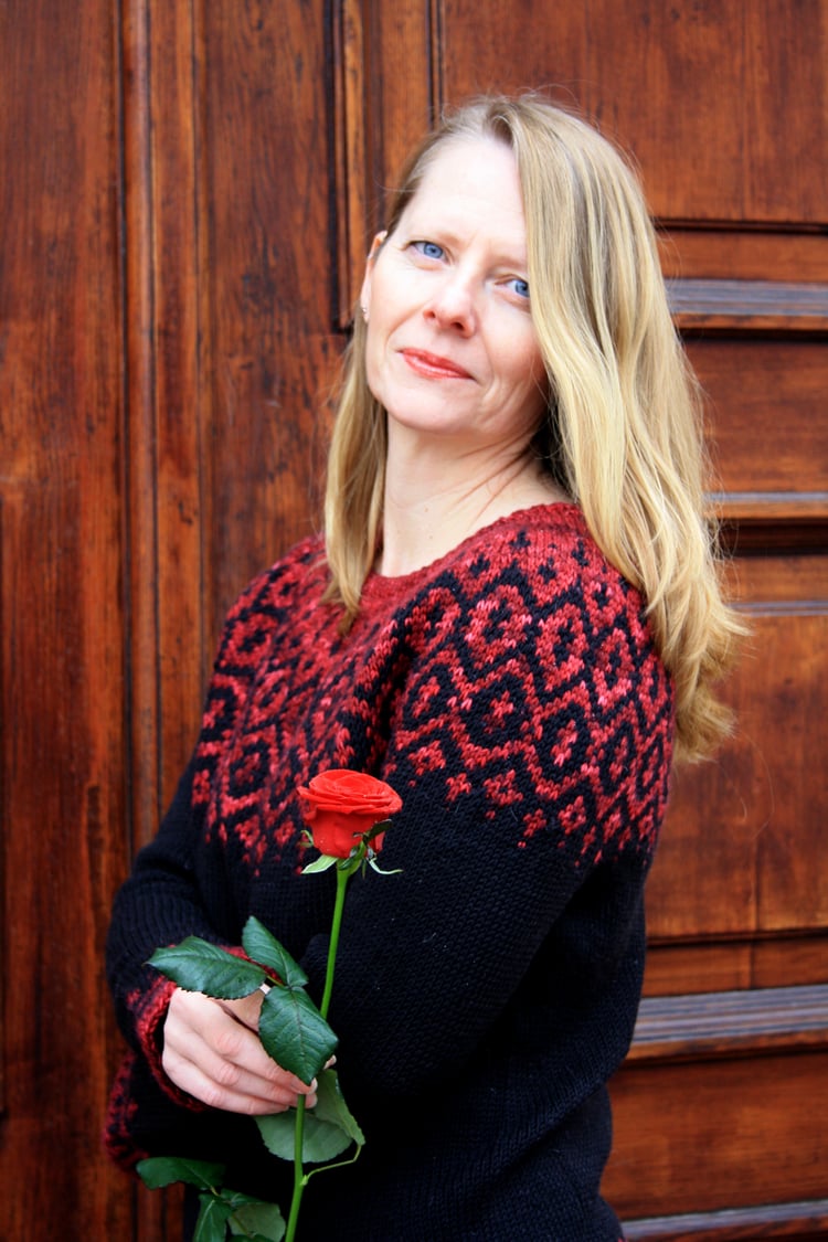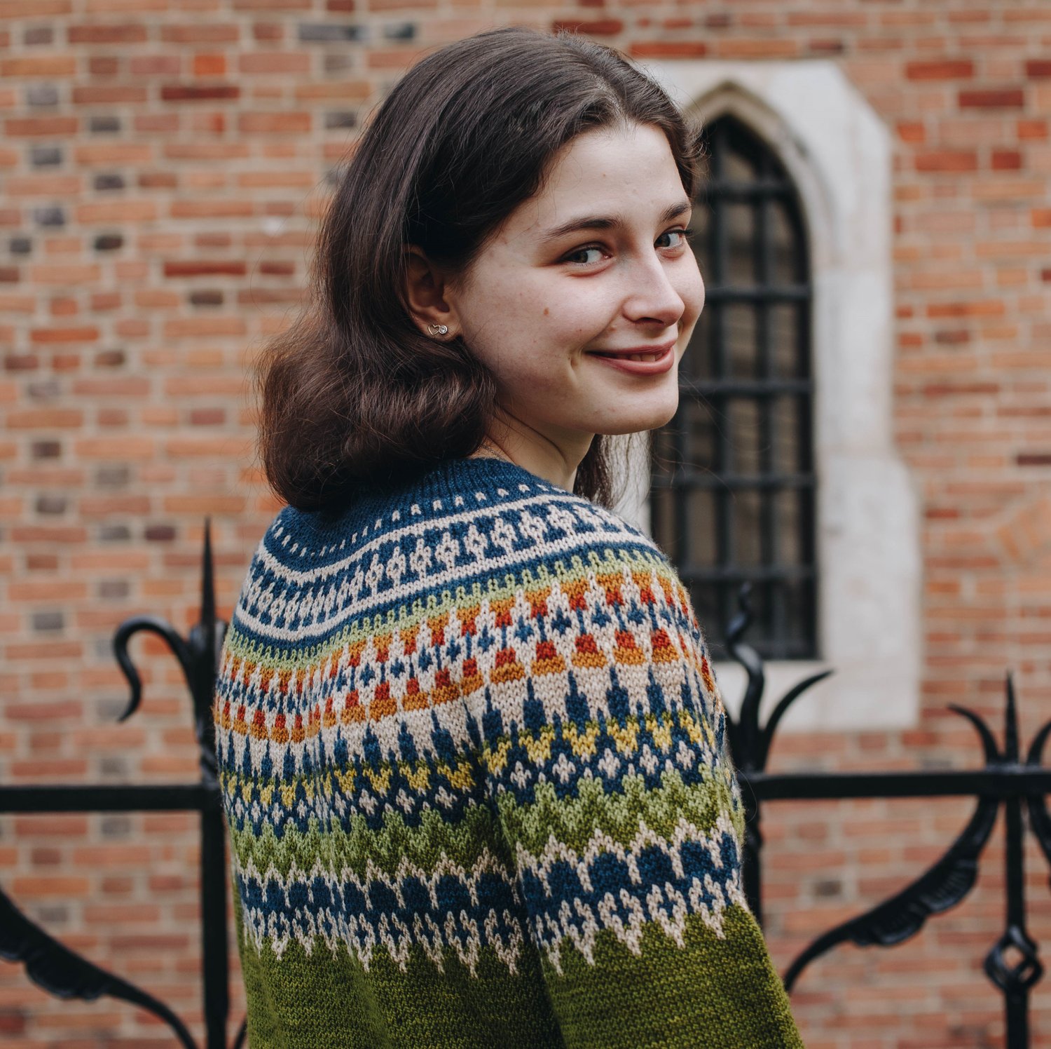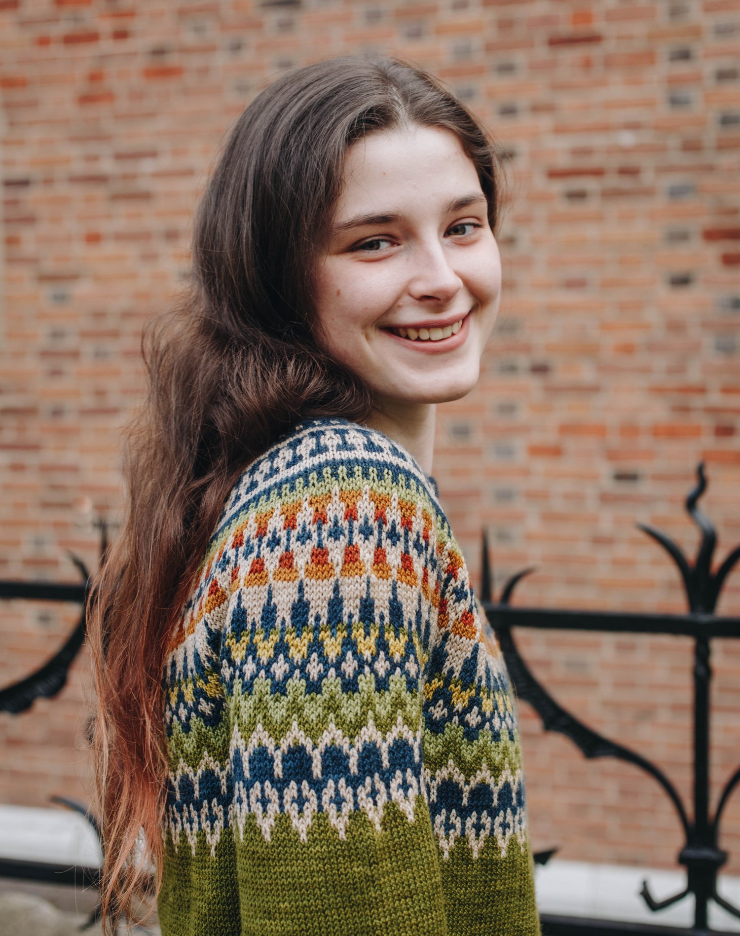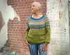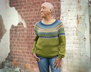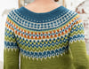 Teranika is a top-down seamless yoke sweater with a deep colorwork chart that uses a series of complementary and contiguous colors worked in a lively contemporary Fair Isle motif. The ribbed neckline is followed by short rows at the back of the neck to create a comfortable fit. This is followed by the stranded knitting that is worked in multiple colors, although there are never more than two colors per round. The chart continues past the sleeve and body divide. The sleeves are knit in stockinette stitch, and the cuffs and body are finished off in ribbing. This pattern includes a symbol chart that can be colored in with your personal choice of colors, as well as a chart for a two-color alternative.