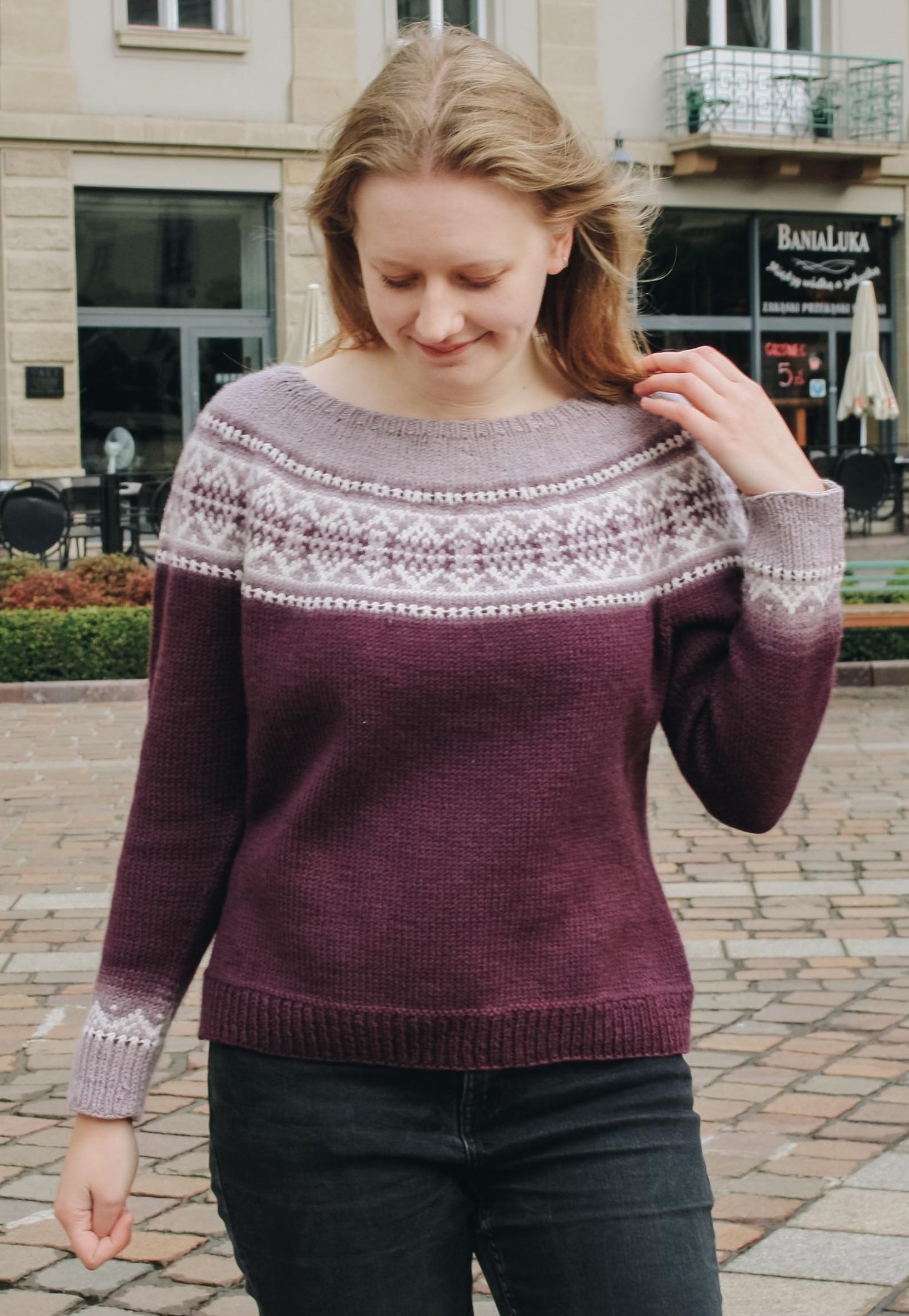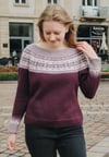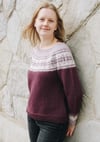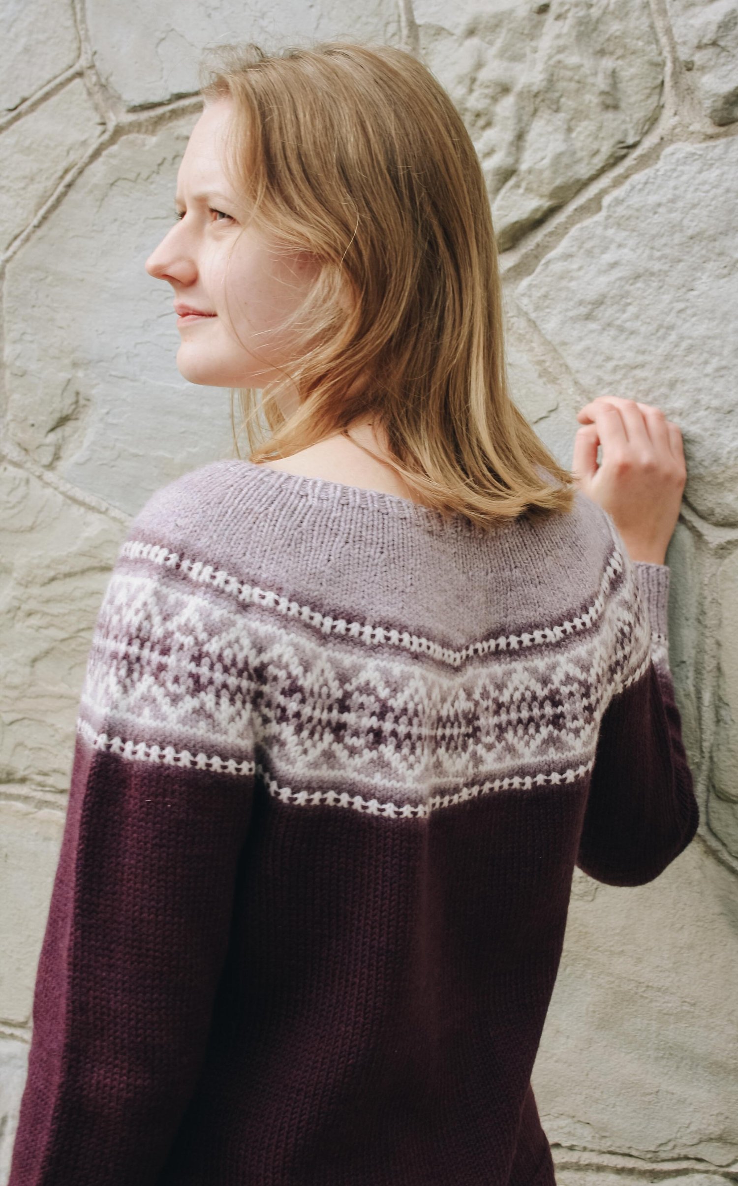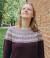 Concinnity is a top-down seamless yoke sweater that is knit in the round. It has short rows at the back of the neck. The yoke is textured with purl stitches, and features a stranded colourwork Fair Isle pattern, that highlights the beautiful gradient fade of the yarn. There is optional waist and hip shaping to add feminine shape, and the bottom cuffs are finished off with small elements of the yoke design.